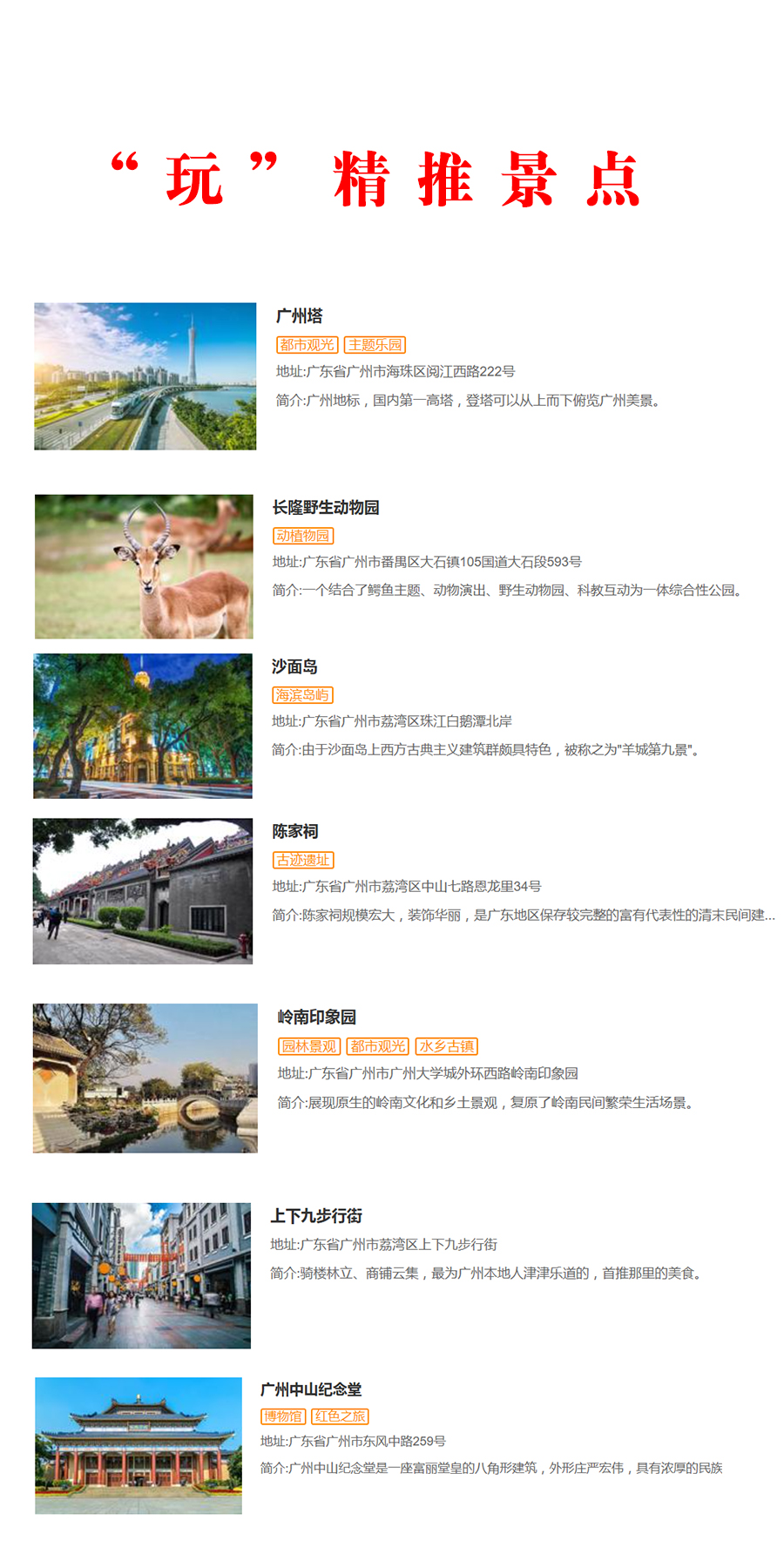 "廣州的景點怡人,以羊城新八景、花卉博覽園、花都香草世界、華南植物園等最為盛名,還有異域風情的沙面和擁有130多年歷史的石室圣心大教堂,及陳家祠、現代化建筑廣州塔和已有2100多年歷史的南越王墓都是值得一看的地方。"